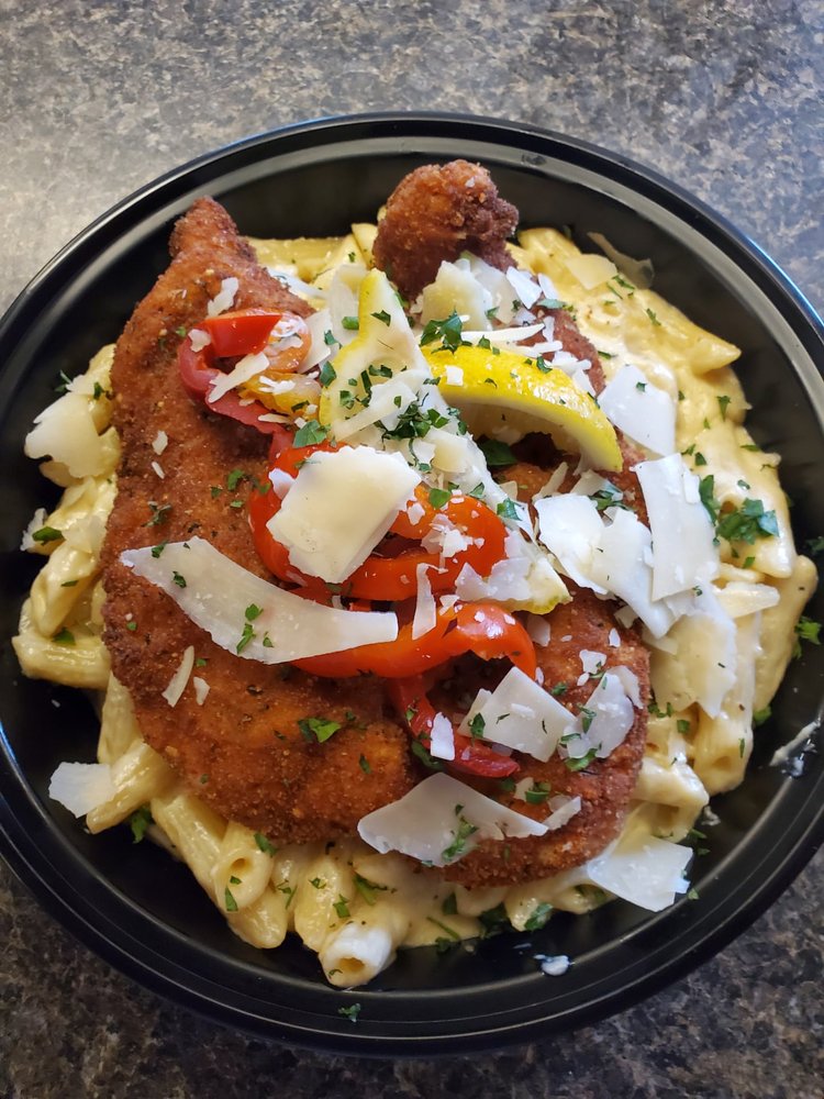 Sauteed chicken breast, garlic, mushrooms, and cherry peppers in a spicy vodka tomato cream sauce topped with melted mozzarella.